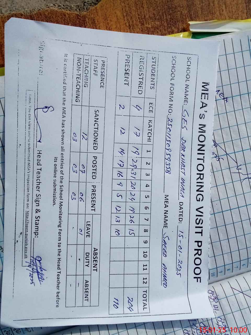 | Attendance Register | Head Teacher | MEA with School | Visit Proof |