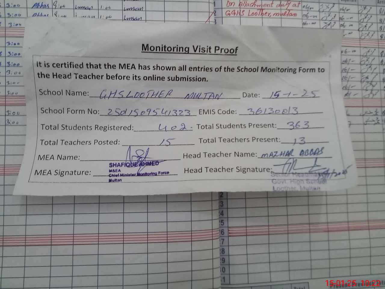 | EMIS Code: 36130013 | Name of School: GHS LOOTHER MULTAN | |||