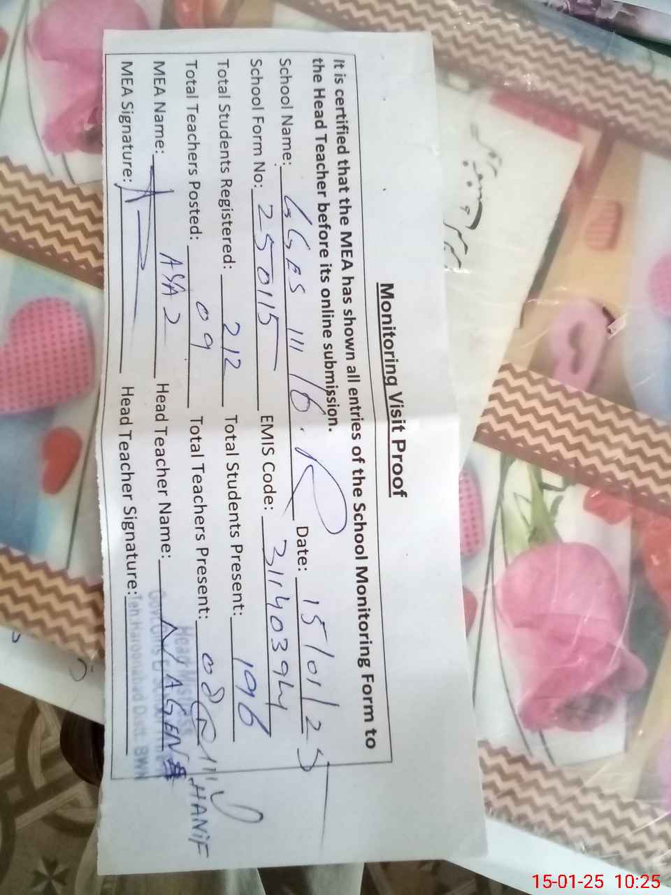 | Attendance Register | Head Teacher | MEA with School | Visit Proof |