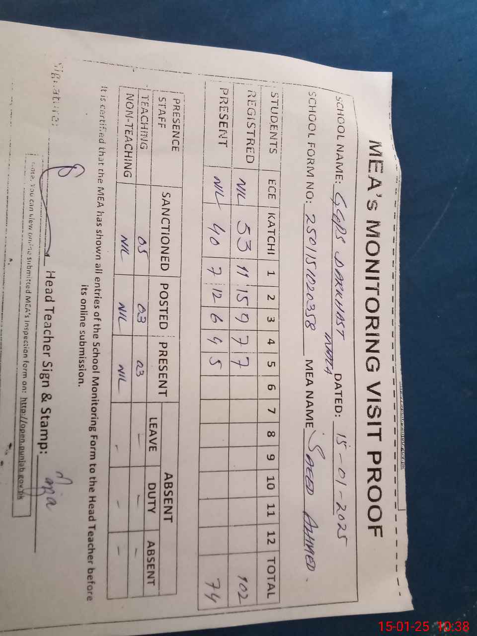 | Attendance Register | Head Teacher | MEA with School | Visit Proof |