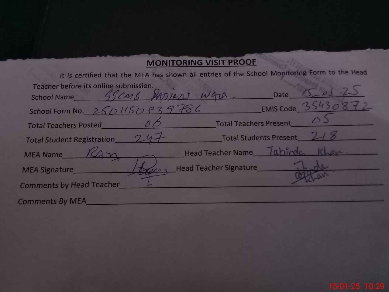 | Attendance Register | Head Teacher | MEA with School | Visit Proof |