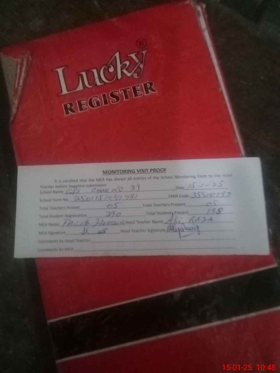 | Attendance Register | Head Teacher | MEA with School | Visit Proof |