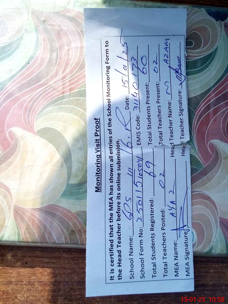 | Attendance Register | Head Teacher | MEA with School | Visit Proof |