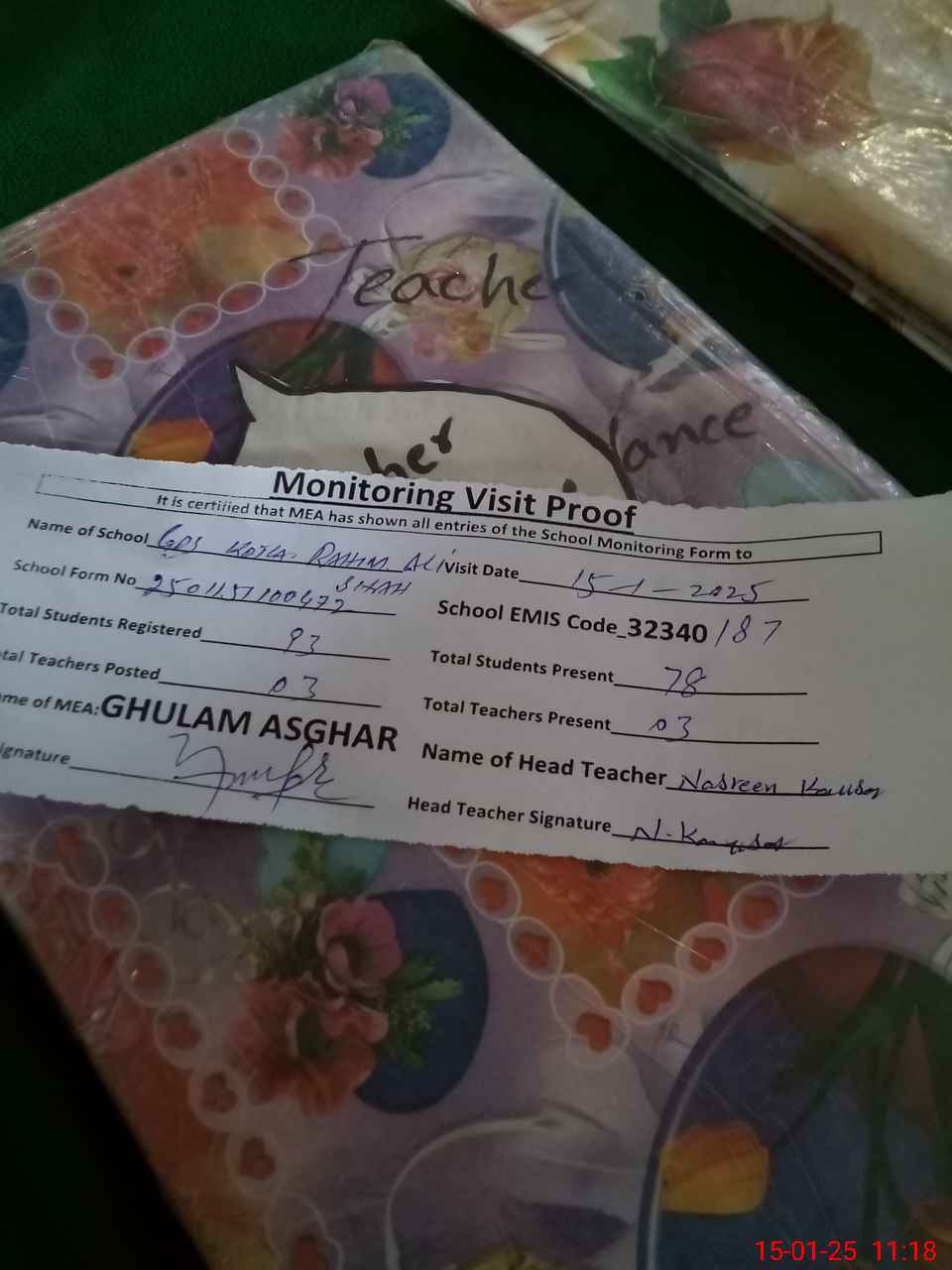 | Attendance Register | Head Teacher | MEA with School | Visit Proof |