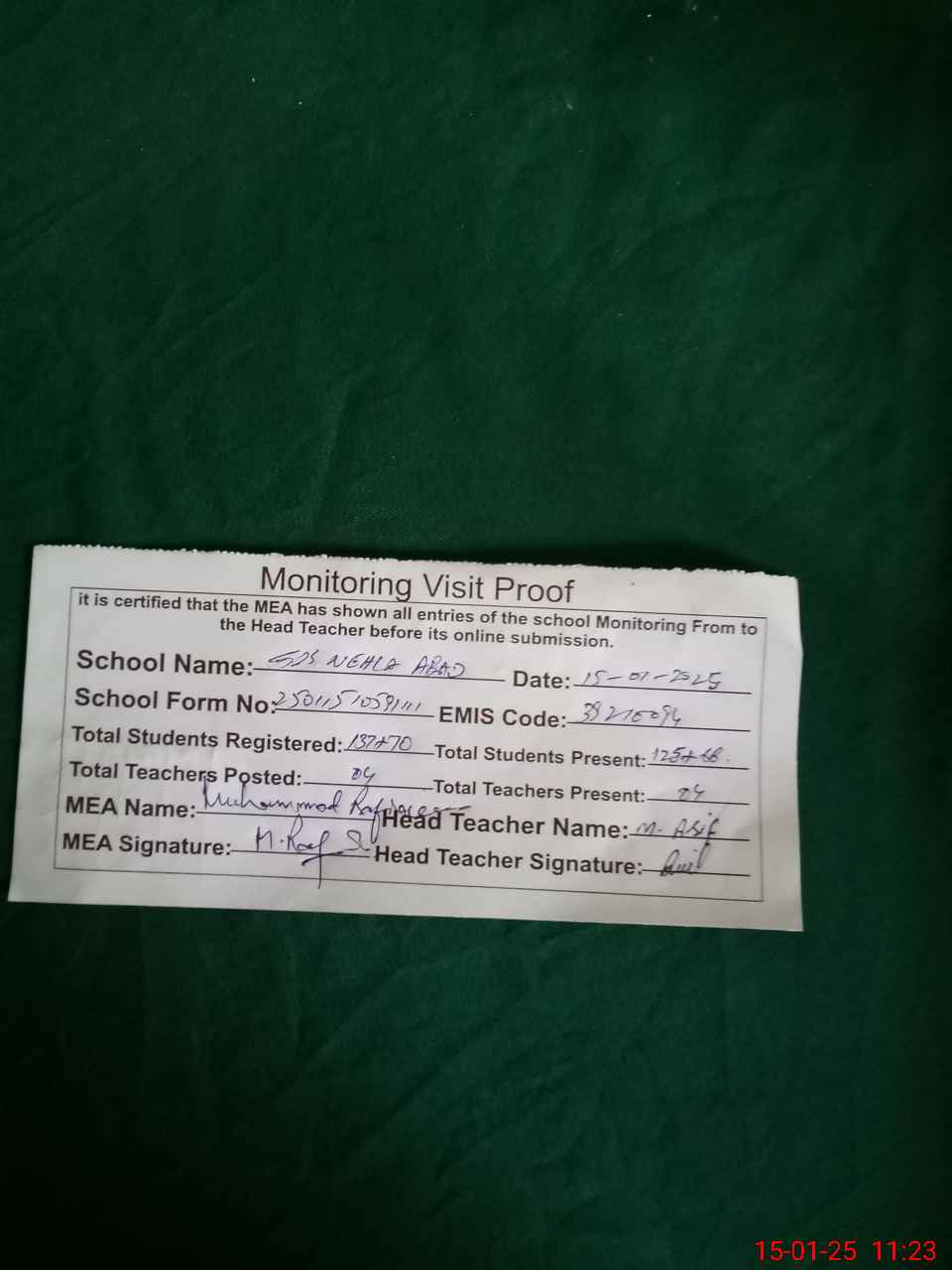 | Attendance Register | Head Teacher | MEA with School | Visit Proof |