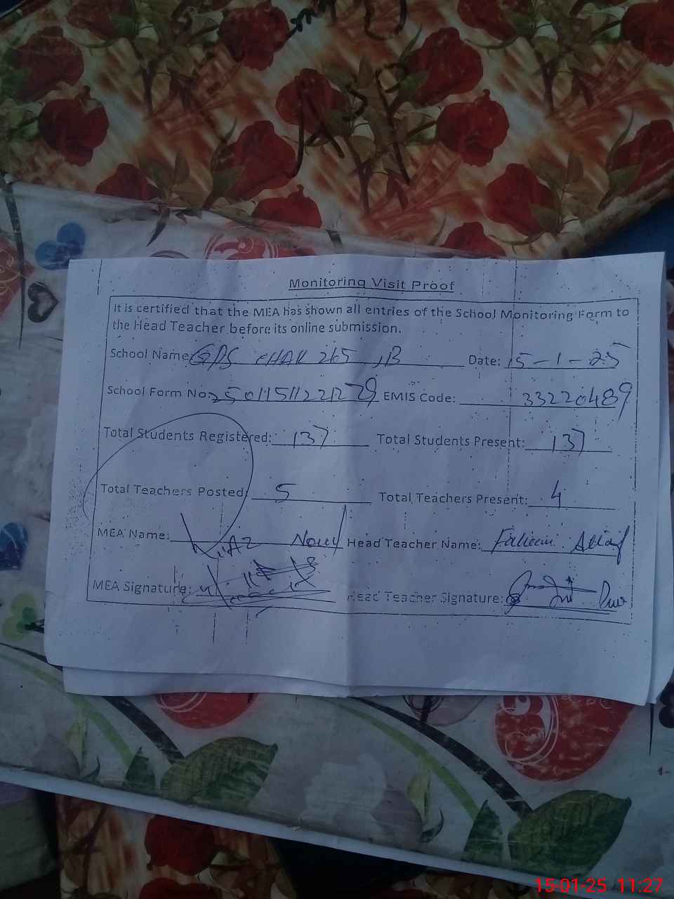 | Attendance Register | Head Teacher | MEA with School | Visit Proof |