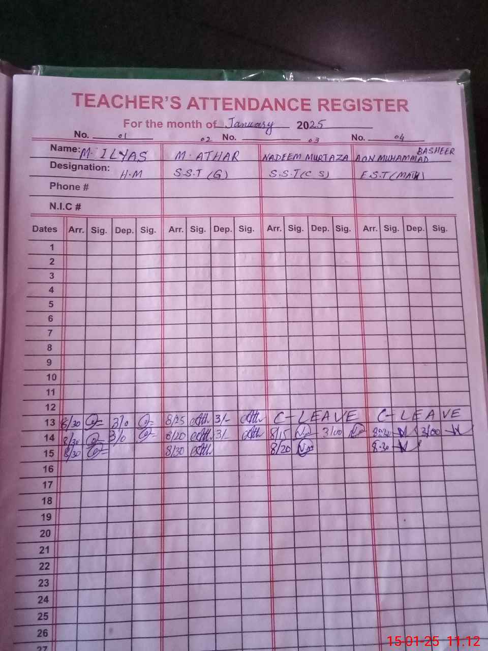 | CNIC | Full Name | Designation | R/C | Absence During Last Calender Month |