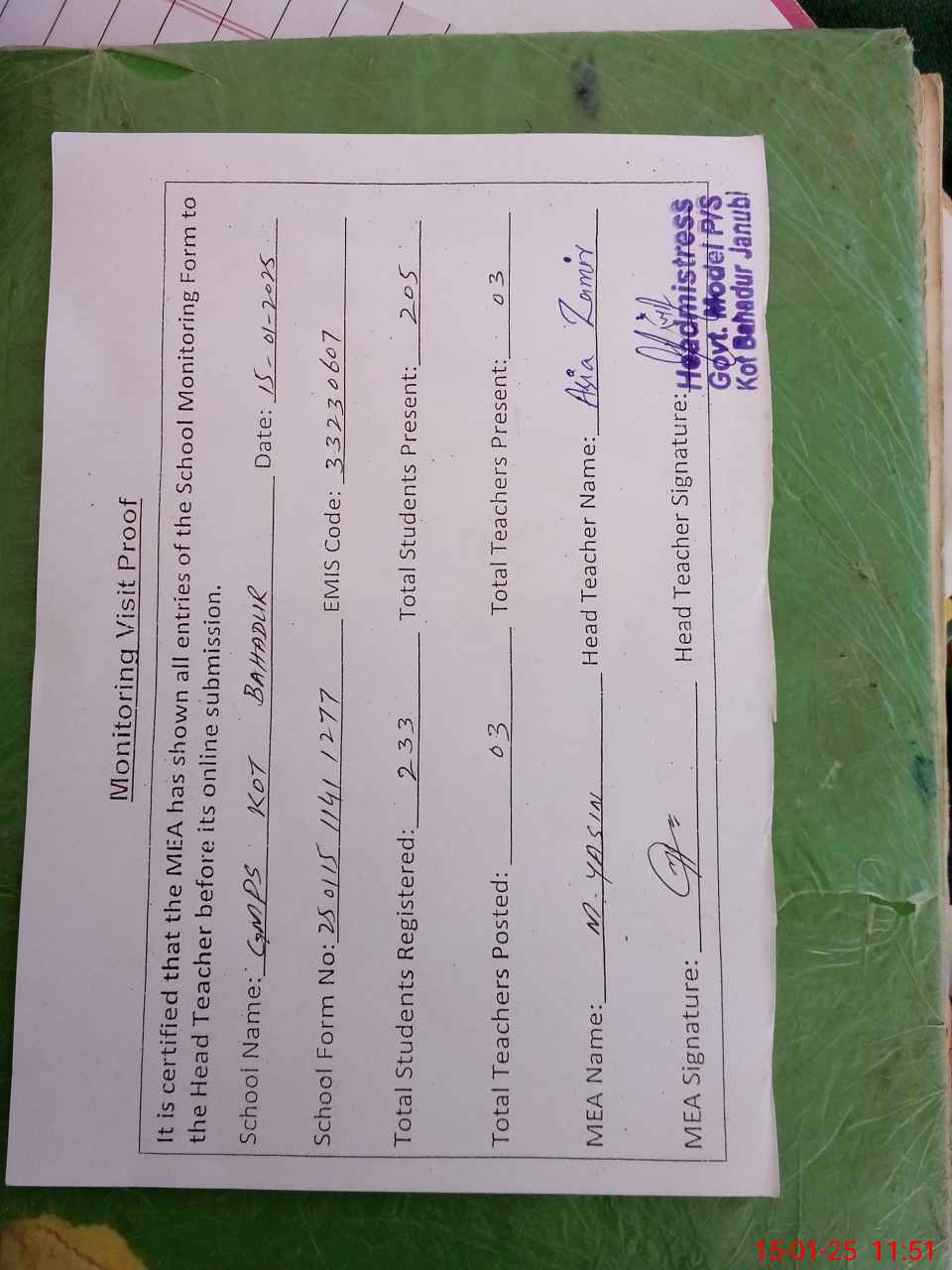 | EMIS Code: 33230607 | Name of School: GMPS KOT BAHADUR JANUBI | |||