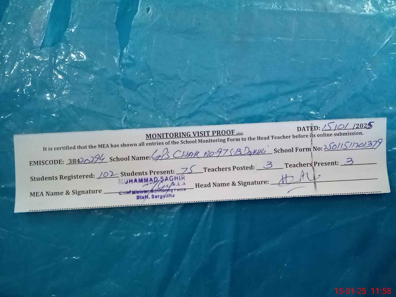 | EMIS Code: 38420294 | Name of School: GPS CHAK NO.97 SB (DAKHLI COLONY) | |||