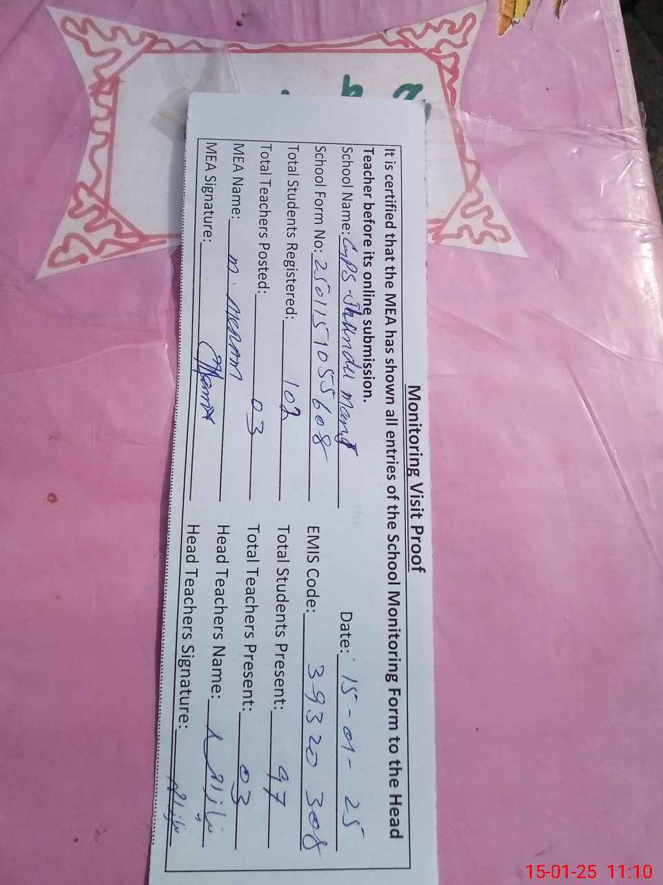 | Attendance Register | Head Teacher | MEA with School | Visit Proof |