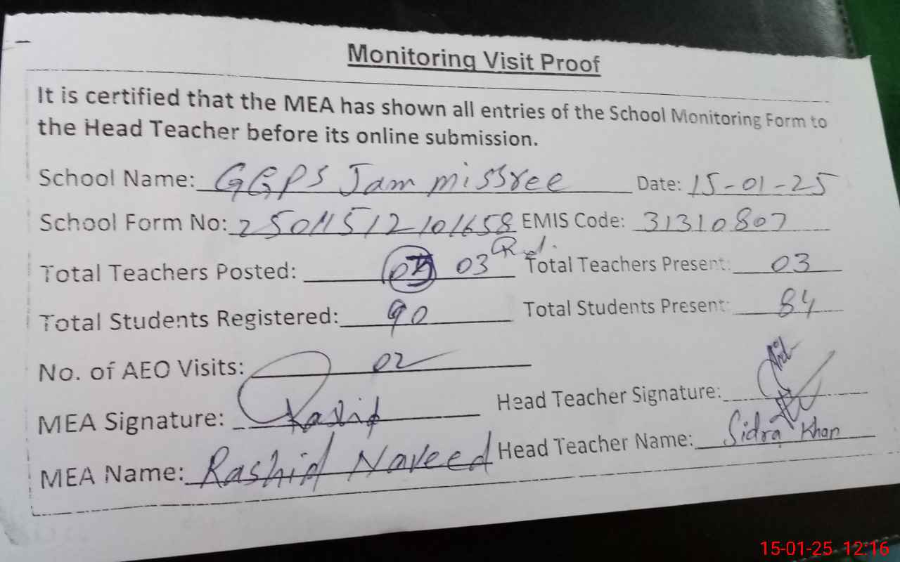 | Attendance Register | Head Teacher | MEA with School | Visit Proof |