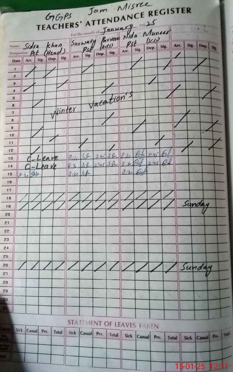 | CNIC | Full Name | Designation | R/C | Absence During Last Calender Month |