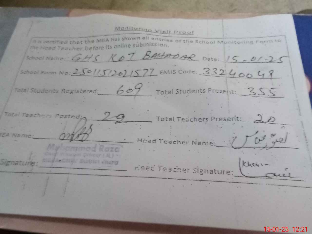 | EMIS Code: 33240049 | Name of School: GHS KOT BAHADAR SHAH | |||