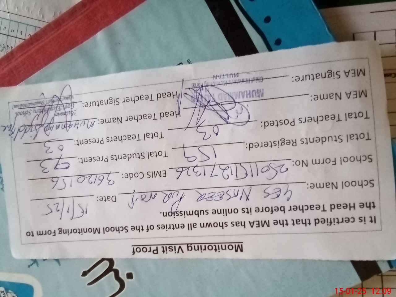 | Attendance Register | Head Teacher | MEA with School | Visit Proof |