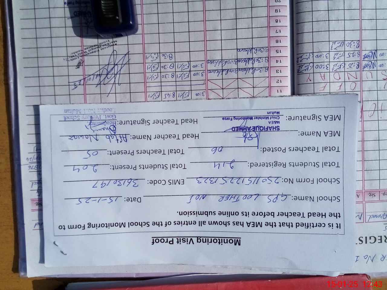 | Attendance Register | Head Teacher | MEA with School | Visit Proof |