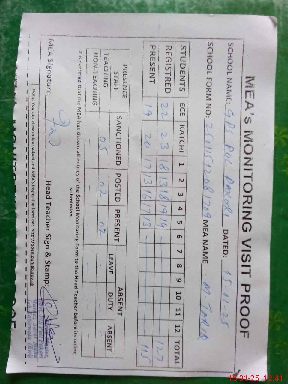 | Attendance Register | Head Teacher | MEA with School | Visit Proof |