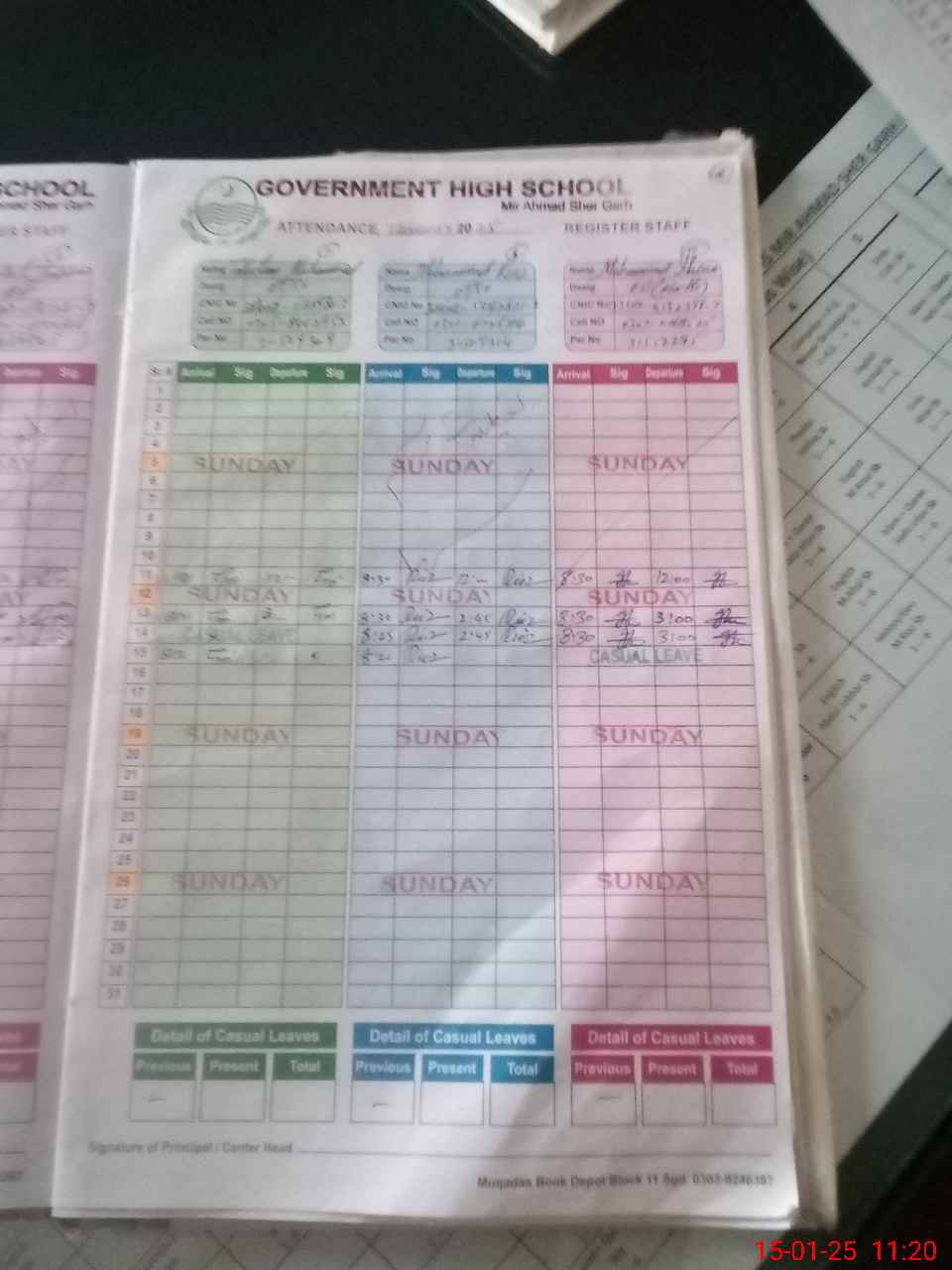 | CNIC | Full Name | Designation | R/C | Absence During Last Calender Month |
