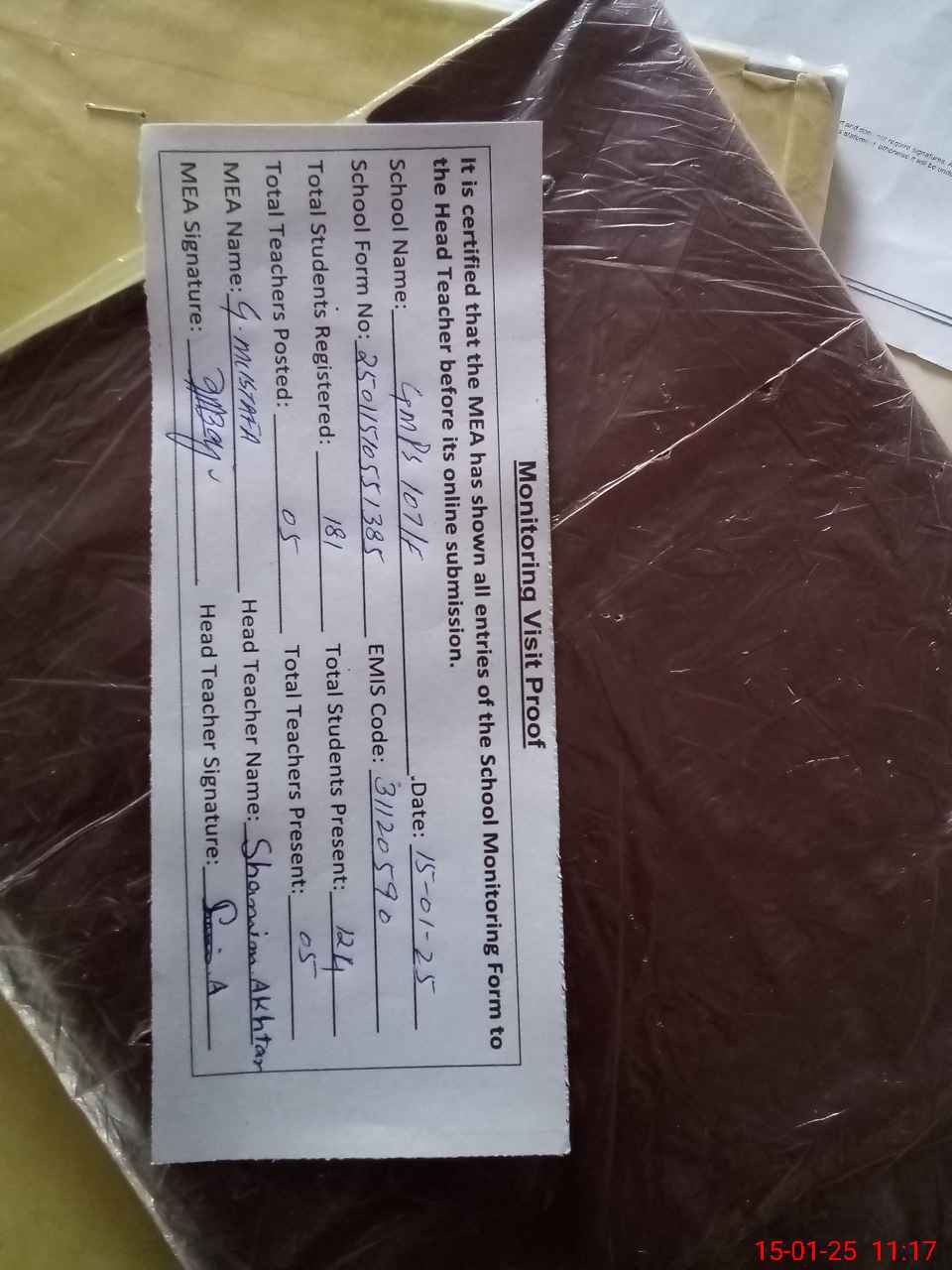 | Attendance Register | Head Teacher | MEA with School | Visit Proof |