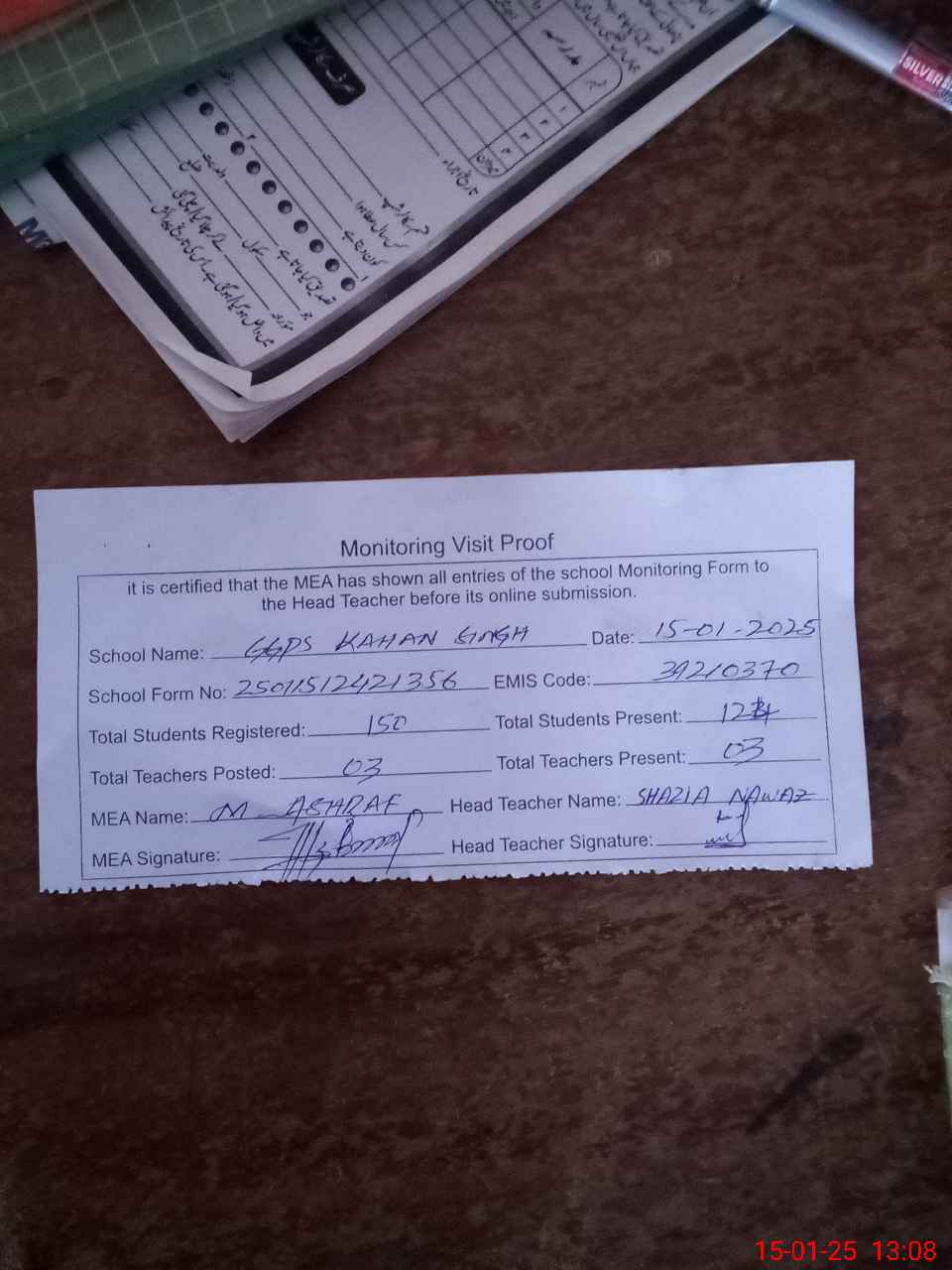 | Attendance Register | Head Teacher | MEA with School | Visit Proof |