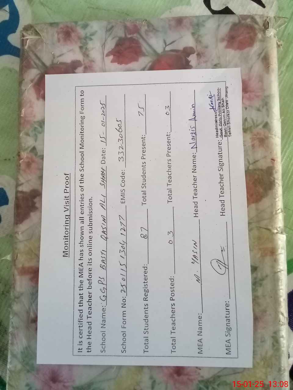 | Attendance Register | Head Teacher | MEA with School | Visit Proof |