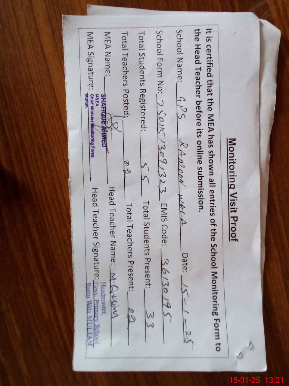 | Attendance Register | Head Teacher | MEA with School | Visit Proof |