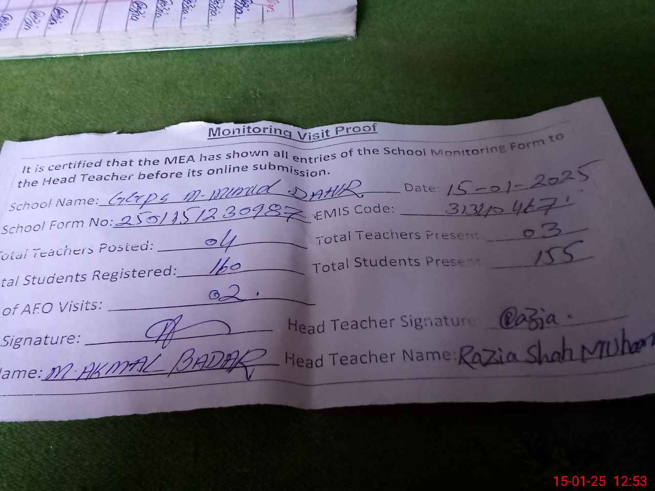 | Attendance Register | Head Teacher | MEA with School | Visit Proof |