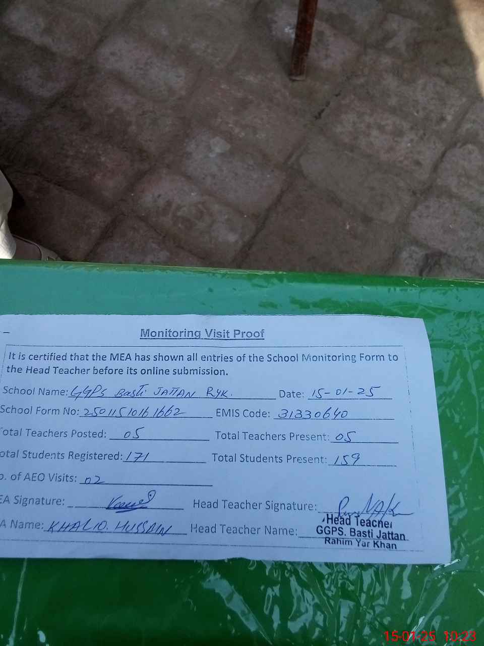 | EMIS Code: 31330640 | Name of School: GGPS BASTI JATTAN R.Y.KHAN (Basti Burra) | |||