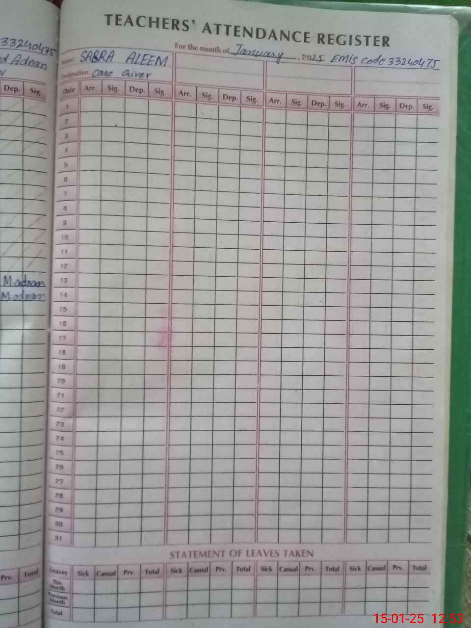 | CNIC | Full Name | Designation | R/C | Absence During Last Calender Month |