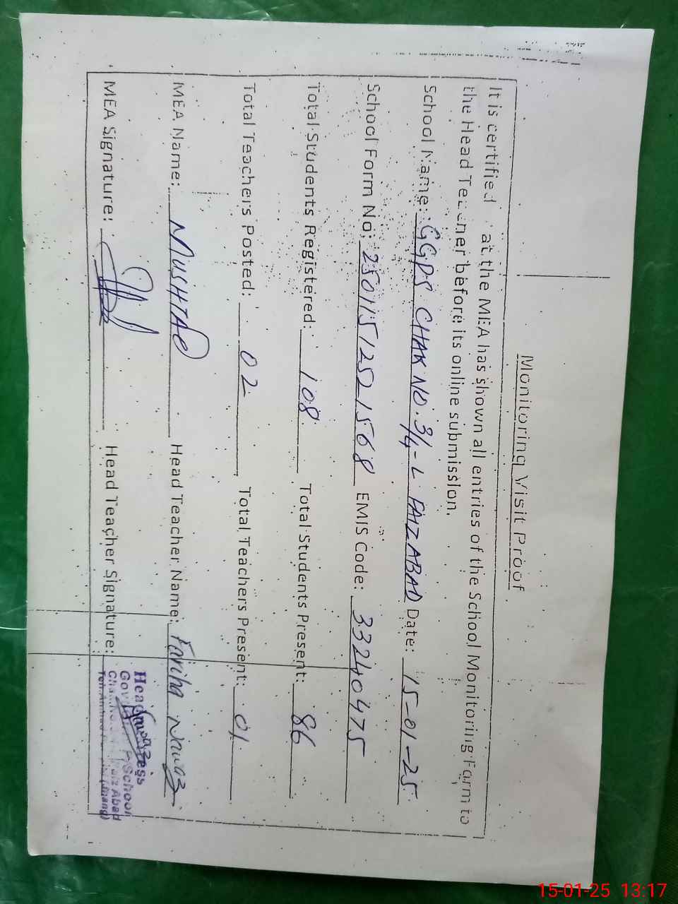 | Attendance Register | Head Teacher | MEA with School | Visit Proof |