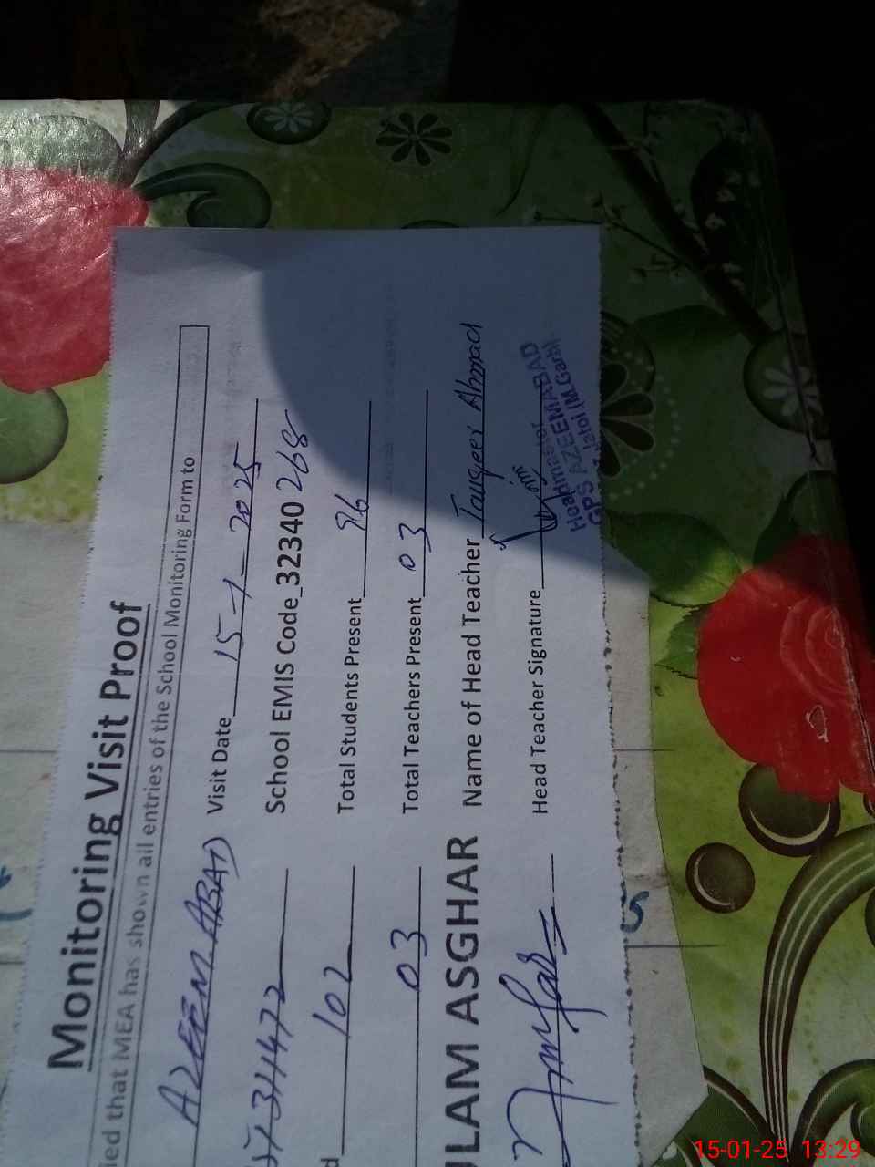 | Attendance Register | Head Teacher | MEA with School | Visit Proof |