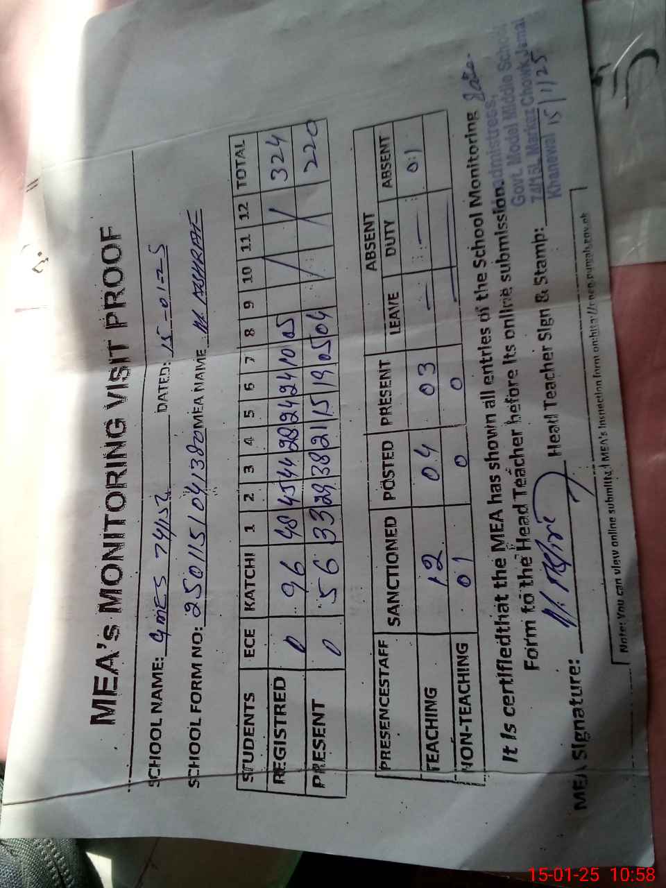 | Attendance Register | Head Teacher | MEA with School | Visit Proof |