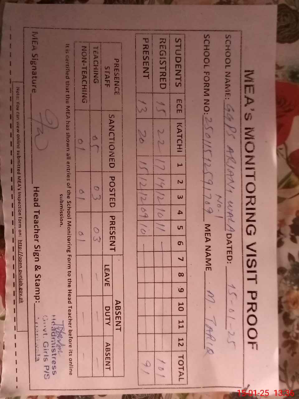 | Attendance Register | Head Teacher | MEA with School | Visit Proof |