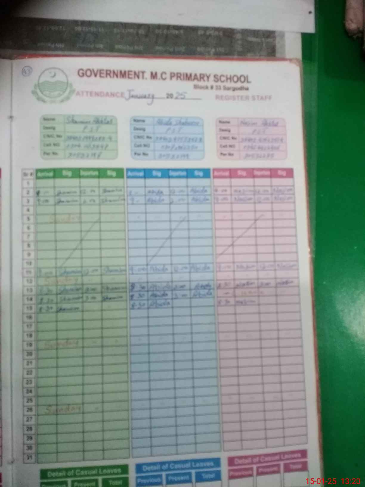 | CNIC | Full Name | Designation | R/C | Absence during last cal. month |