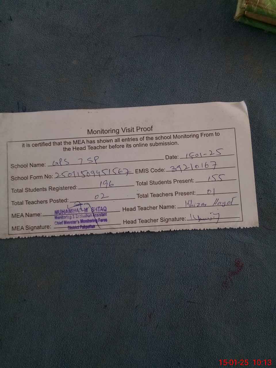 | EMIS Code: 39210167 | Name of School: GPS 7 SP PO MOLVI WALA PAKPATTAN | |||
