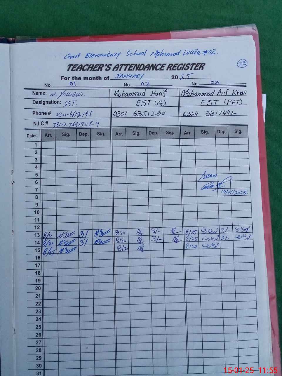 | CNIC | Full Name | Designation | R/C | Absence during last cal. month |