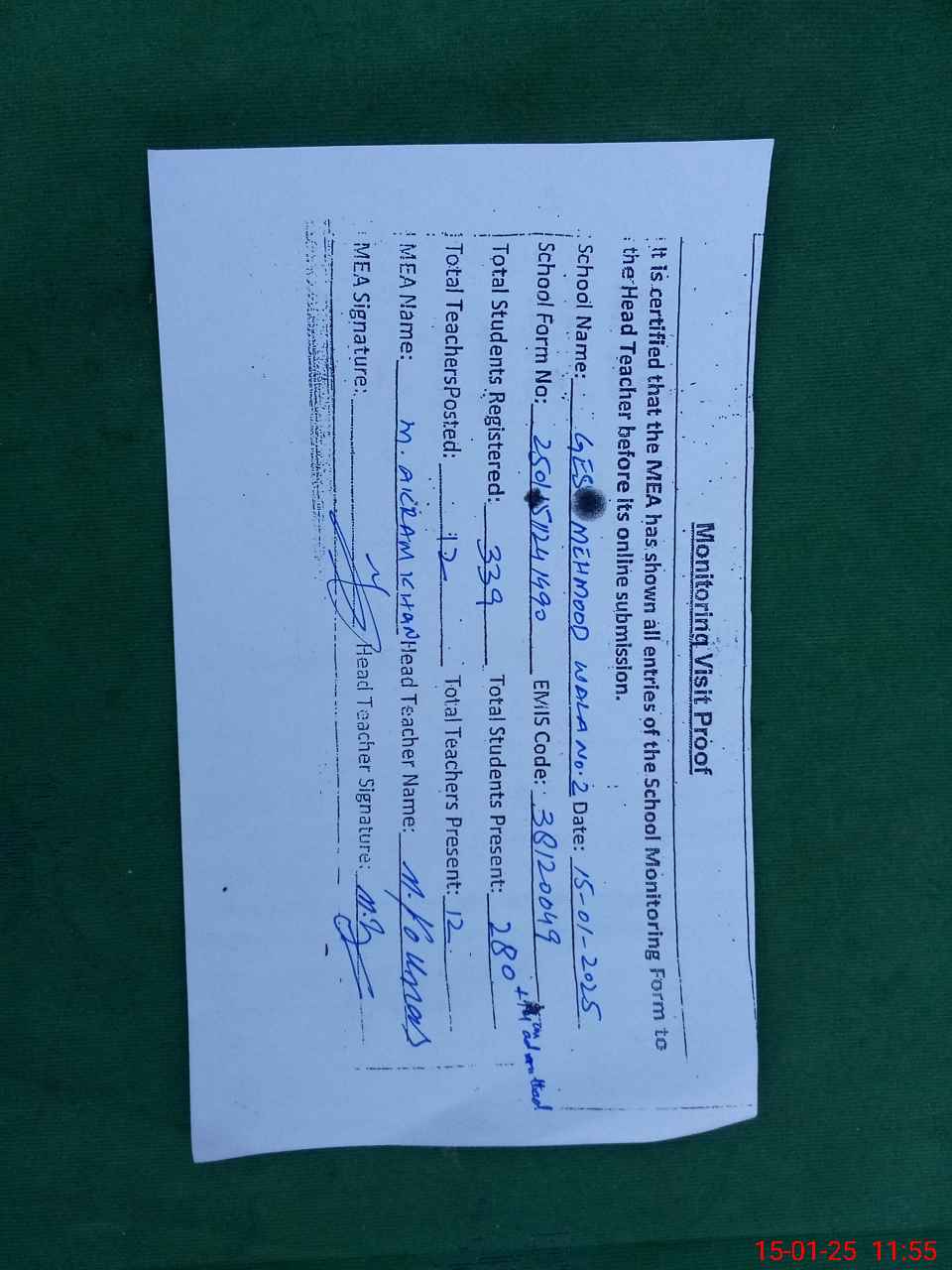 | Certified that this School was Inspected by the Undersigned MEA/DMO Today and the Information Stated Above is as Per Record. | |||||