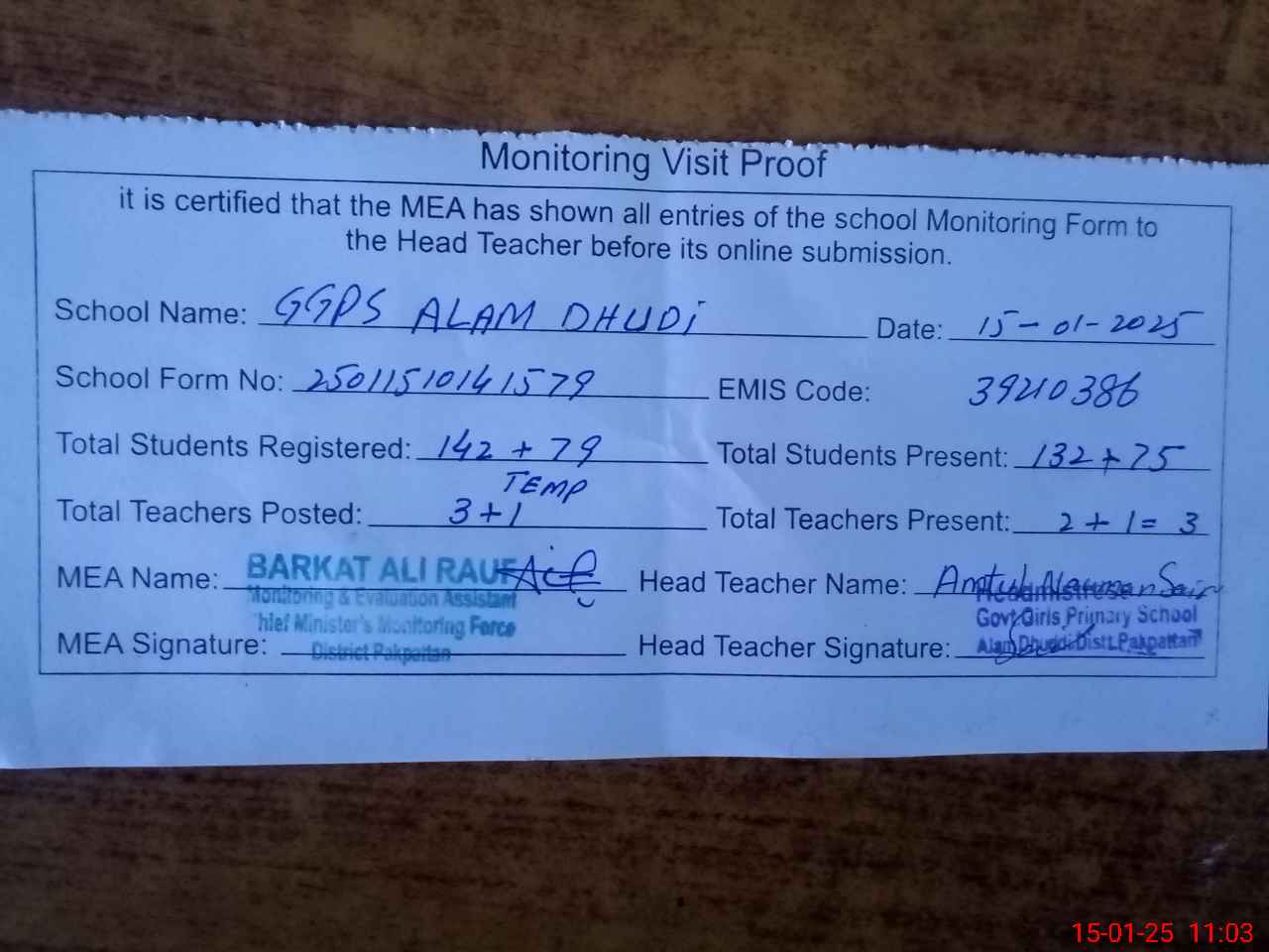 | Attendance Register | Head Teacher | MEA with School | Visit Proof |