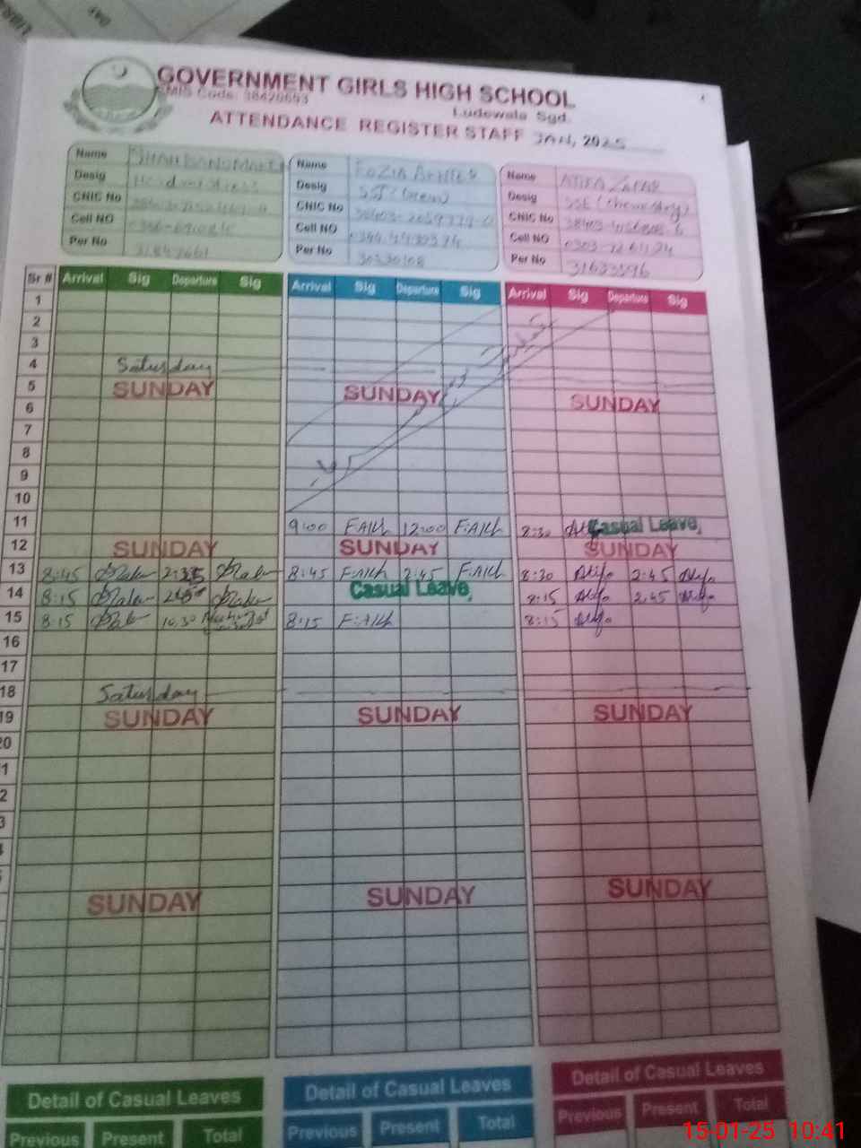 | CNIC | Full Name | Designation | R/C | Absence during last cal. month |