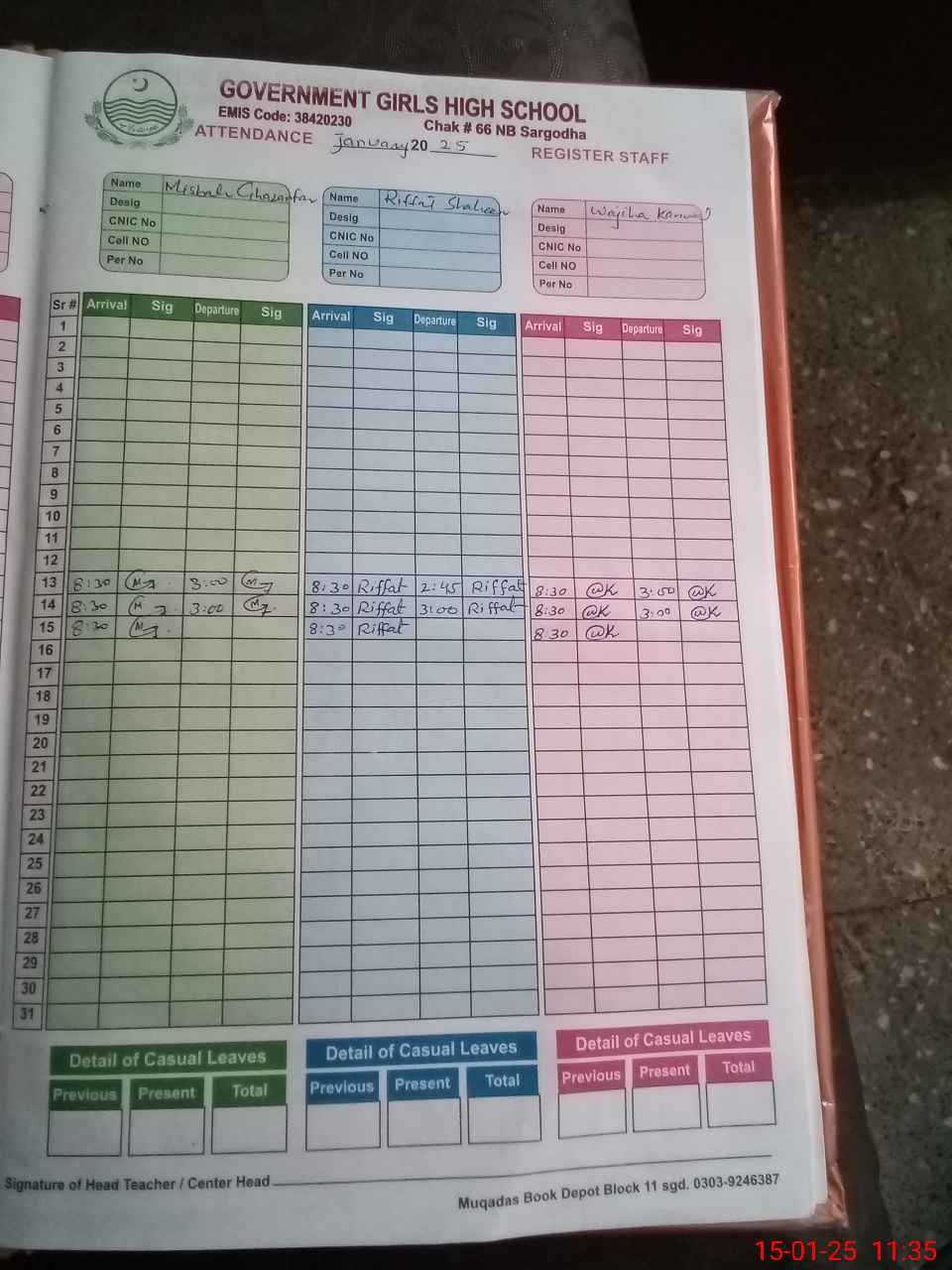| CNIC | Full Name | Designation | R/C | Absence During Last Calender Month |
