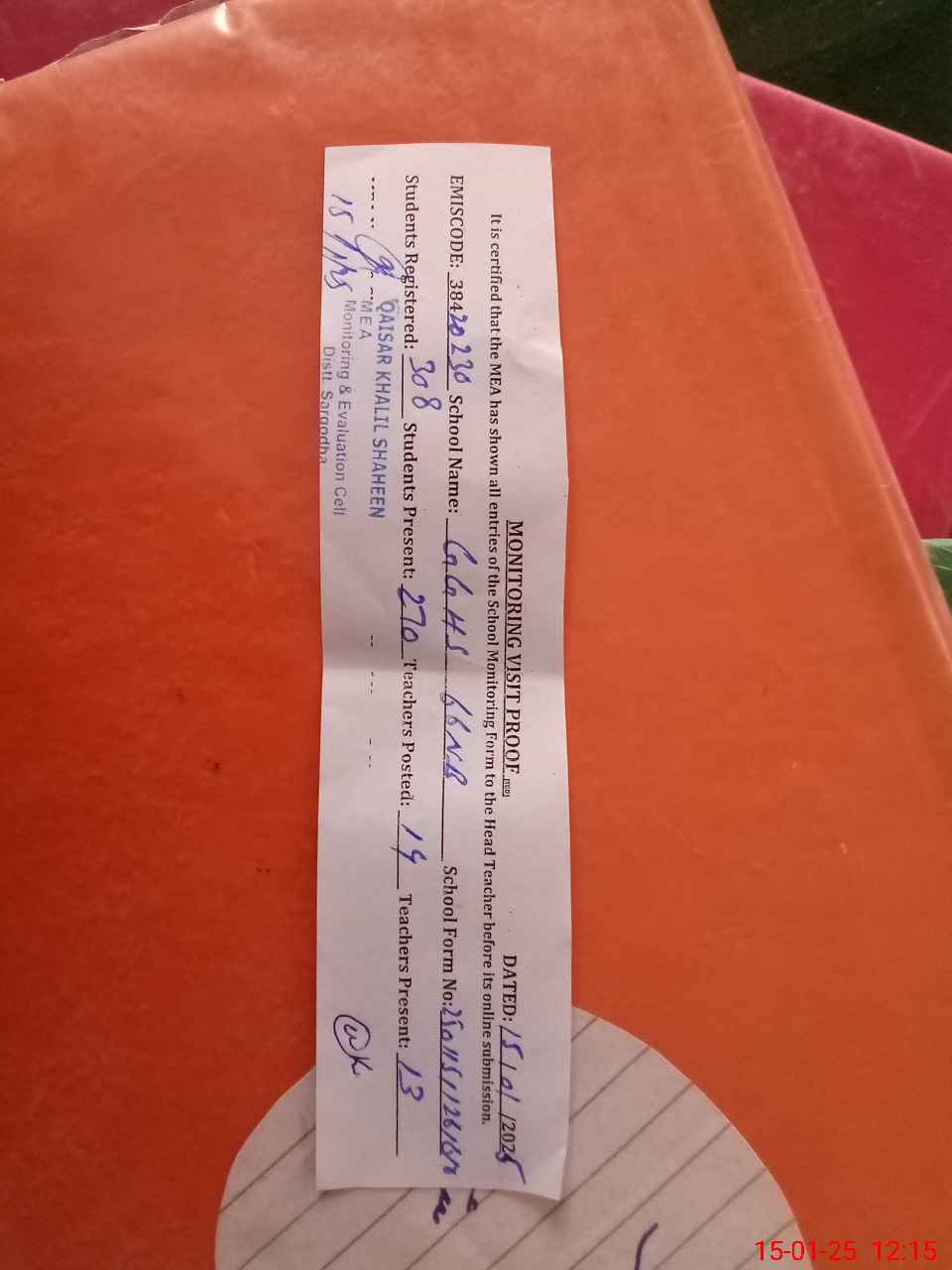 | Attendance Register | Head Teacher | MEA with School | Visit Proof |