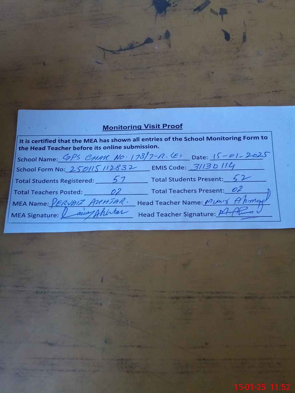 | Attendance Register | Head Teacher | MEA with School | Visit Proof |