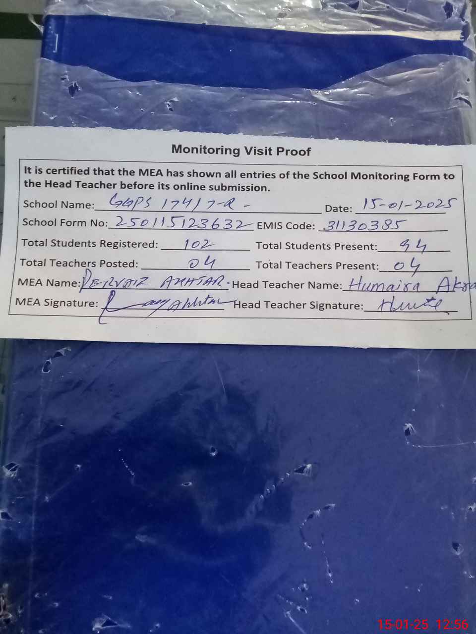 | Attendance Register | Head Teacher | MEA with School | Visit Proof |