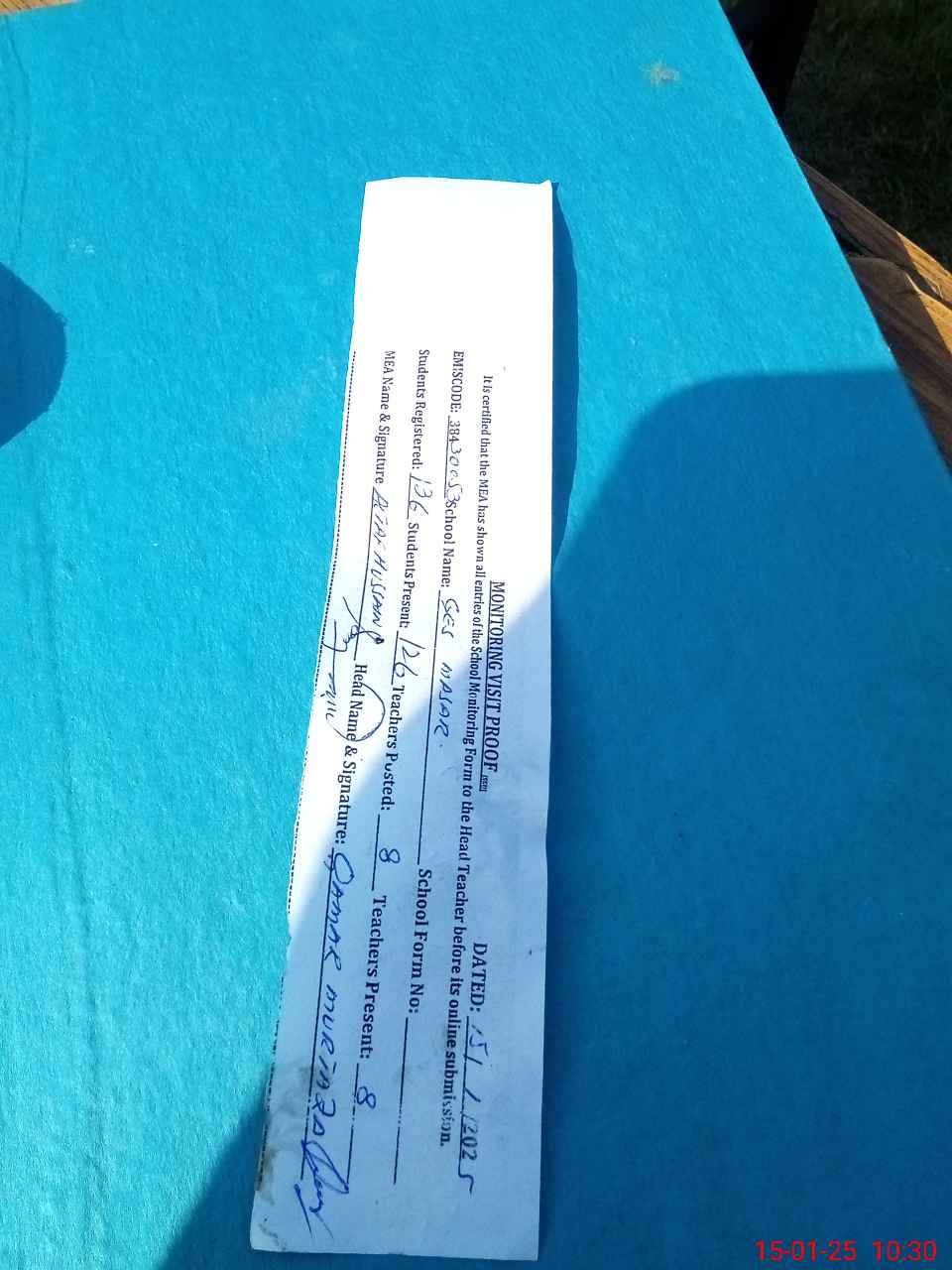 | Attendance Register | Head Teacher | MEA with School | Visit Proof |