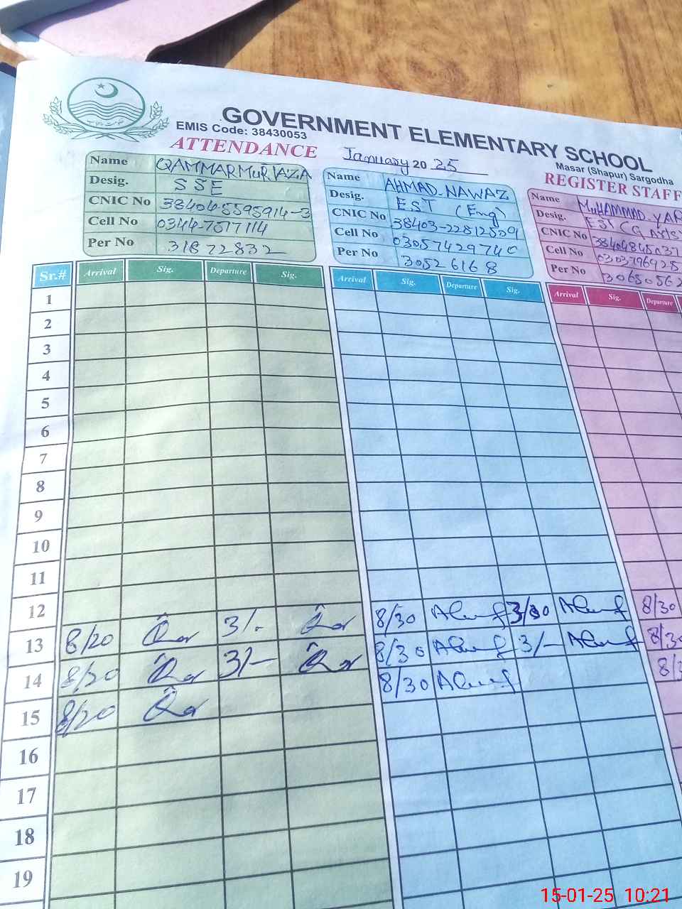 | CNIC | Full Name | Designation | R/C | Absence during last cal. month |