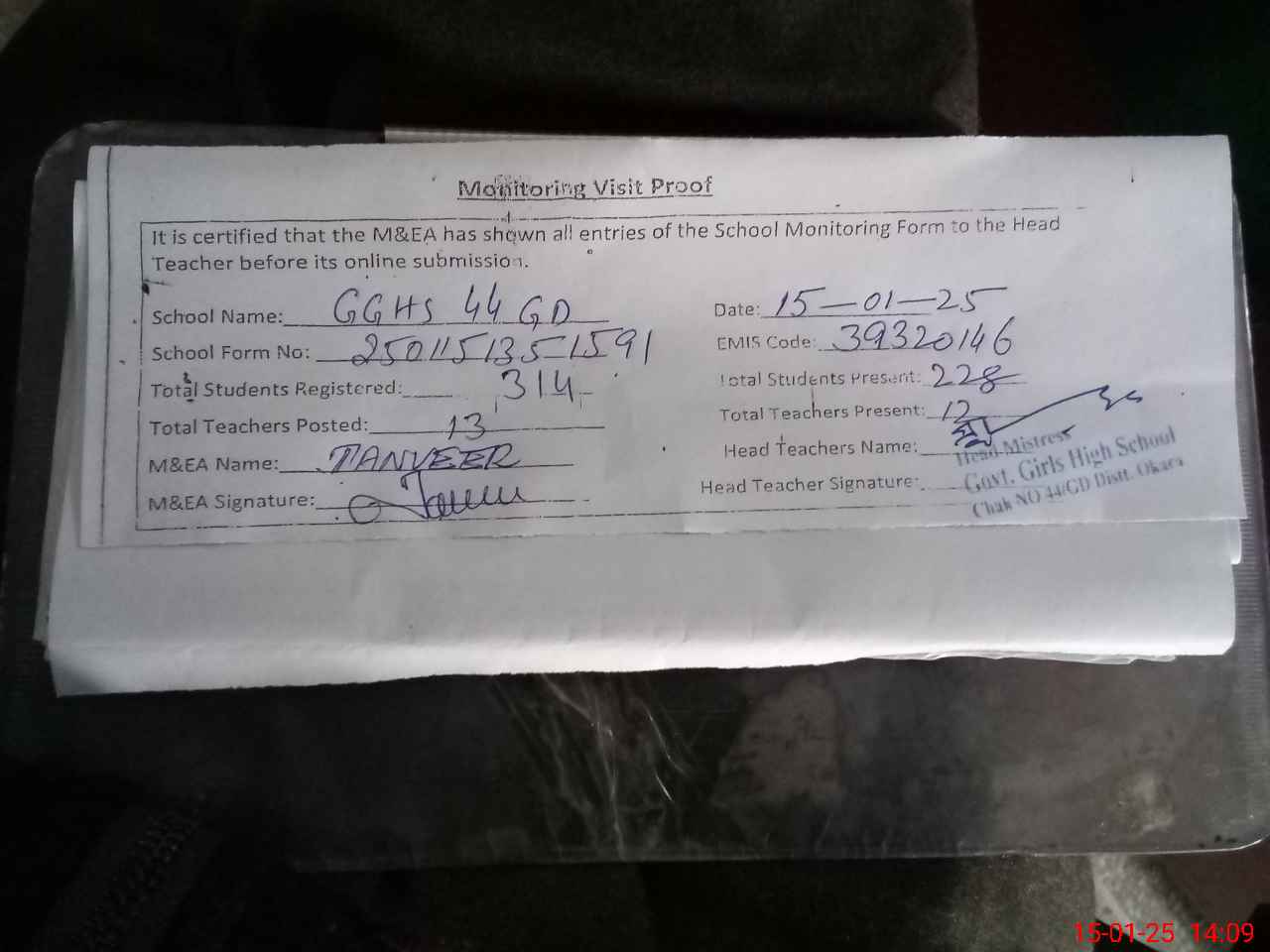 | Attendance Register | Head Teacher | MEA with School | Visit Proof |