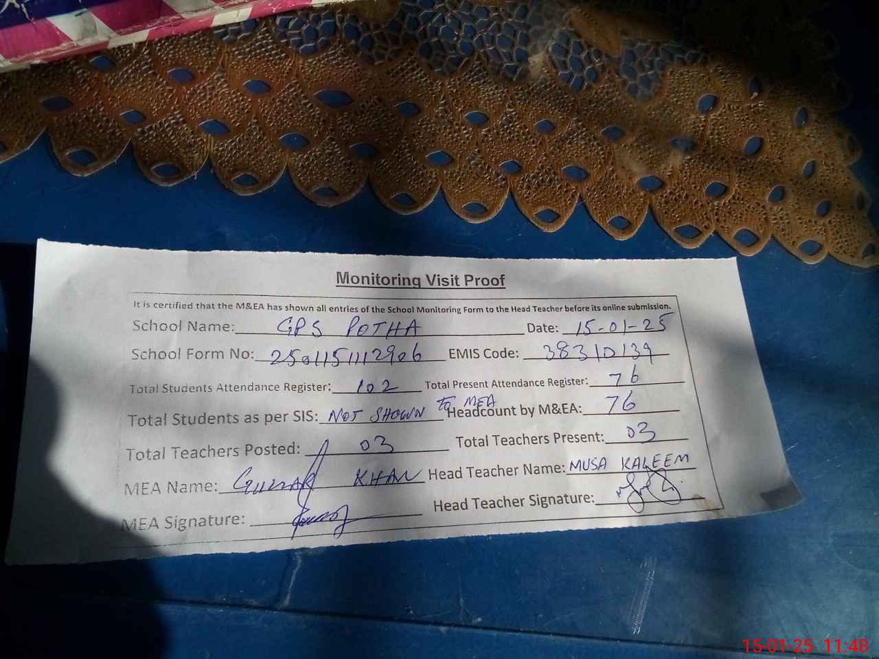 | Attendance Register | Head Teacher | MEA with School | Visit Proof |