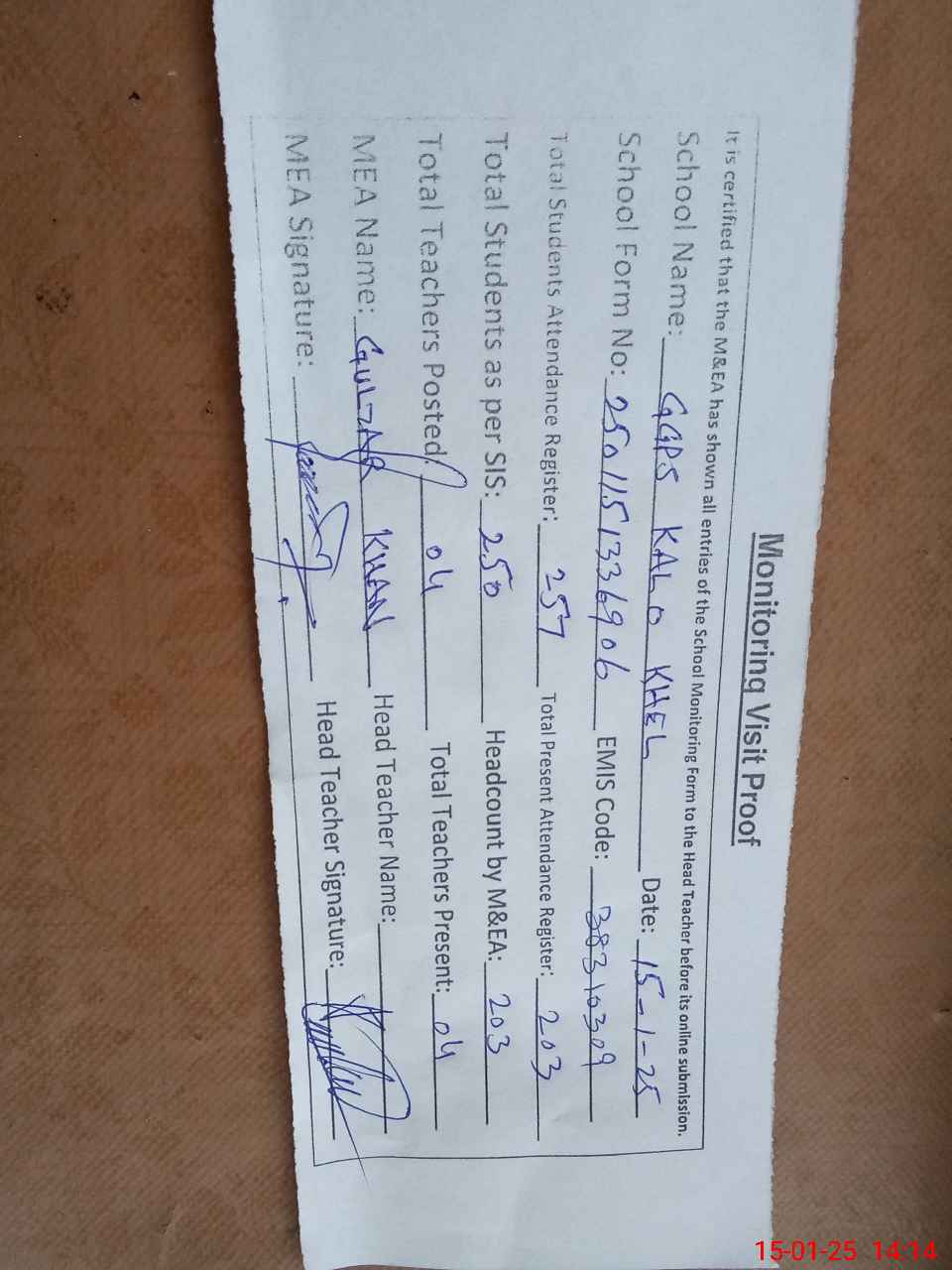 | Attendance Register | Head Teacher | MEA with School | Visit Proof |