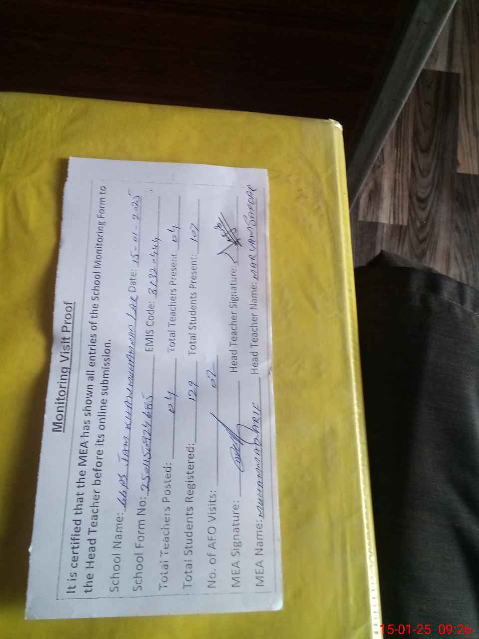 | Attendance Register | Head Teacher | MEA with School | Visit Proof |