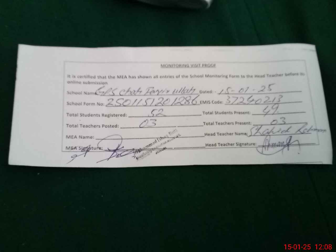 | Attendance Register | Head Teacher | MEA with School | Visit Proof |