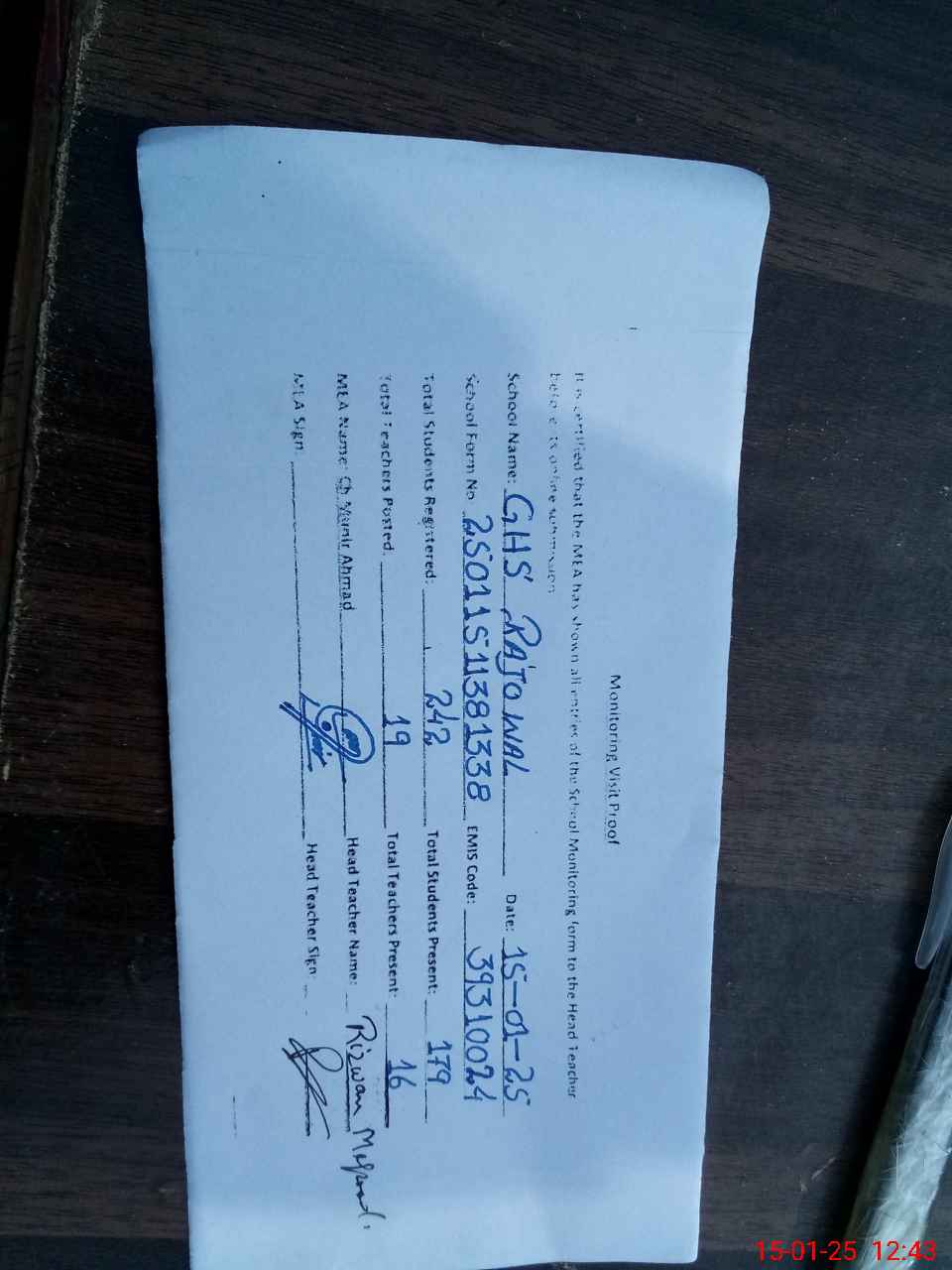 | Attendance Register | Head Teacher | MEA with School | Visit Proof |